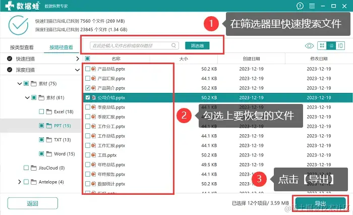 步骤4:选择所有需要恢复的文件并点击【导出】后。为恢复后的文件选择正确的保存位置。