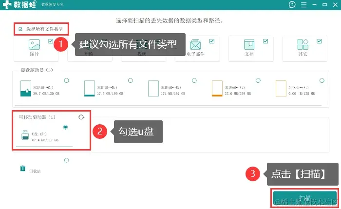 步骤2:对需要扫描的文件类型进行勾选,并勾选上 【u盘】,单击 【扫描】;