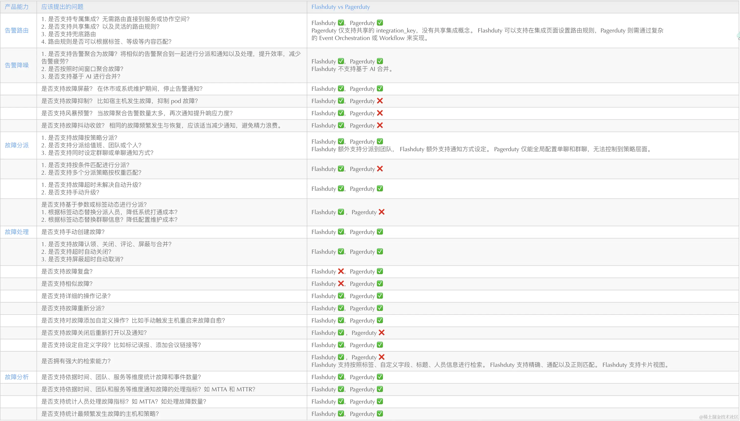 下面笔者将从产品功能这个维度,来探讨国内外这两款 OnCall 工具 Flashduty 和 Pagerduty 的差异。