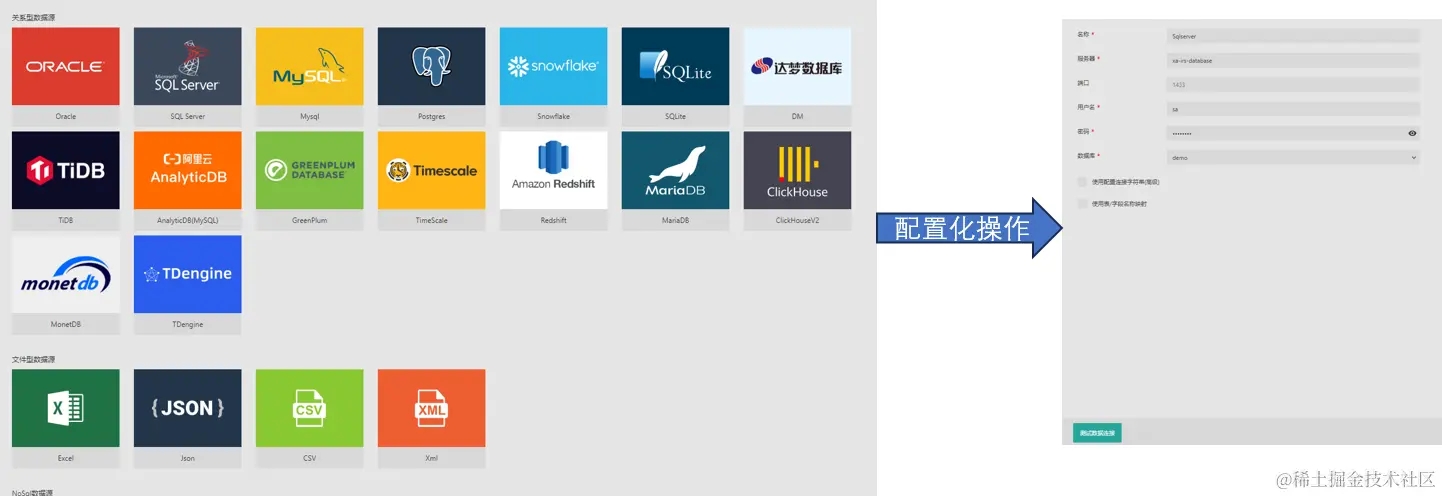 打开设计器直接进行数据源的对接,Wyn商业智能支持50+数据源类型,包括Oracle SQL Server MySQL Postgres SQLite等。