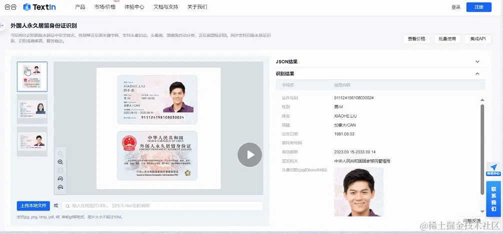 进行新版永居证识别时,合合信息永居证识别产品可结构化识别新版证件的中英文姓名、性别、出生日期、国籍、证件号码、有效期、签发机关等正反面关键字段,支持头像切边,头像面、国徽面自动分类,正反面混贴识别,并同步支持新版与2017年既往版本永居证识别。相关产品可应用于交通出行、生活消费、金融通信等公共服务,以及政务服务领域、互联网平台等多个场景的用户身份认证。