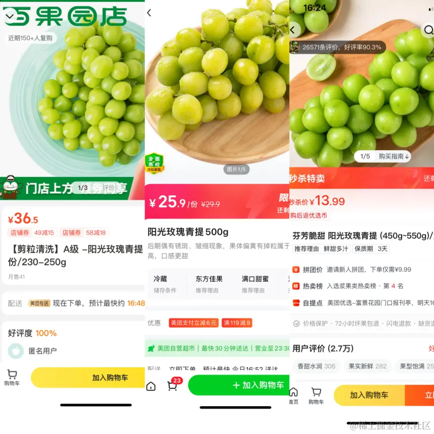 对此,伯虎财经分别在百果园(美团外卖店)、小象超市、美团优选这三个渠道搜索“阳光玫瑰青提”,得到的价格分别是36.5元(230-250g)、25.9元(500g)、13.99元(450-550g)。