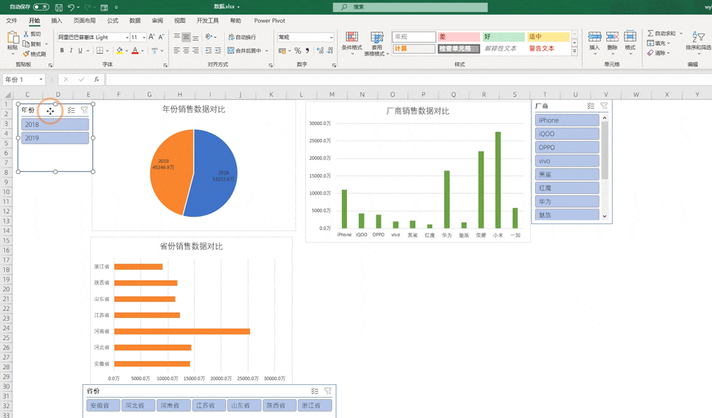 为了让多张图表能够联动变化,点击数据透视表,在工具栏中找到插入切片器,然后分别勾选,年份,省份,厂商点击确定,这样的话就插入了3个切片器,随后将他们更改下大小放在合适的位置即可。随后点击一个切片器,在切片器选项中选择链接到报表,勾选其他的两个报表即可,以此类推,其余的2个切片器也需要这样设置,设置完毕后就制作完毕了。