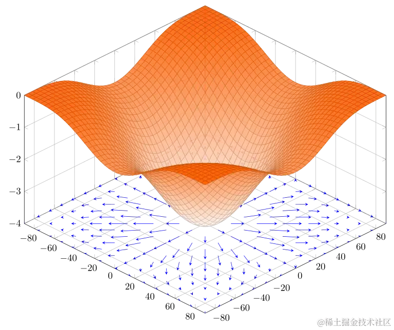 下图为一个曲面在直角坐标系中,各个整数坐标的梯度方向。假设最底端是我们想去的地方,那么需要在各个坐标的位置上不断的向梯度的反方向移动一小段距离△即可,注意每次移动都需要调整方向。这样即可把目标“如何达到最底端” 拆解成为一个可执行的数学公式。