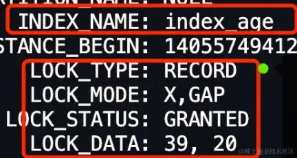 - LOCK_DATA 个数值,也就是 39, 它代表的是 age 值。从前面我们也知道了,LOCK_DATA 个数值是 next-key 锁和间隙锁锁住的范围的右边界值。
