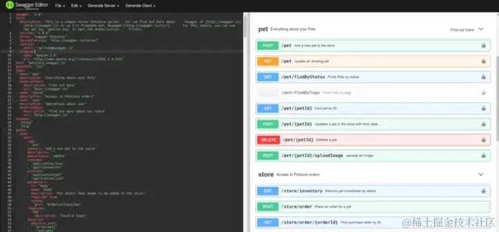 Swagger Editor是一款非常不错的API开发工具,专门用于生成一个具有互动性的API控制台,开发者可以用来快速学习和尝试API。还可以生成客户端SDK代码用于各种不同的平台上的实现。Swagger Editor是使用OpenAPI规范(以前称为Swagger)的简单方法,它支持Swagger 2.0和OpenAPI 3.0。我在docker容器上的本地计算机中使用了swagger编辑器。(下载地址:swagger.io/tools/swagg…