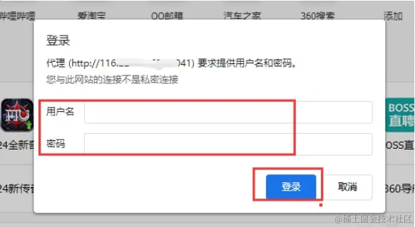 5.现在回到360浏览器访问网站,会弹出一个登录框,在登陆框内输入代理IP的用户名和密码,点击登陆就可以正常使用了