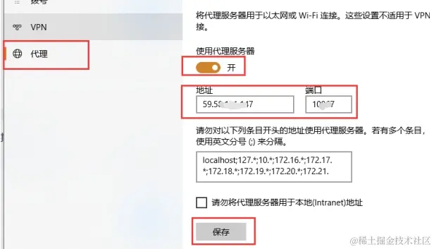 4.点击"更改代理服务器设置"后看到下面的页面,我们把使用代理服务器点击成打开,然后在地址和端口里面输入一连代理IP提取到的代理IP信息