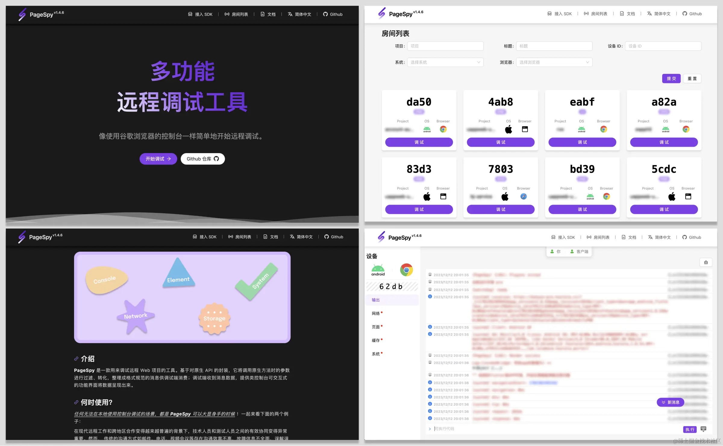 PageSpy 是一款用来调试远程 Web 项目的工具。它能够对后端 API 的报文进行过滤,转化,整理成格式规范的消息供调试端消费,并提供可交互式的功能界面将数据呈现出来。