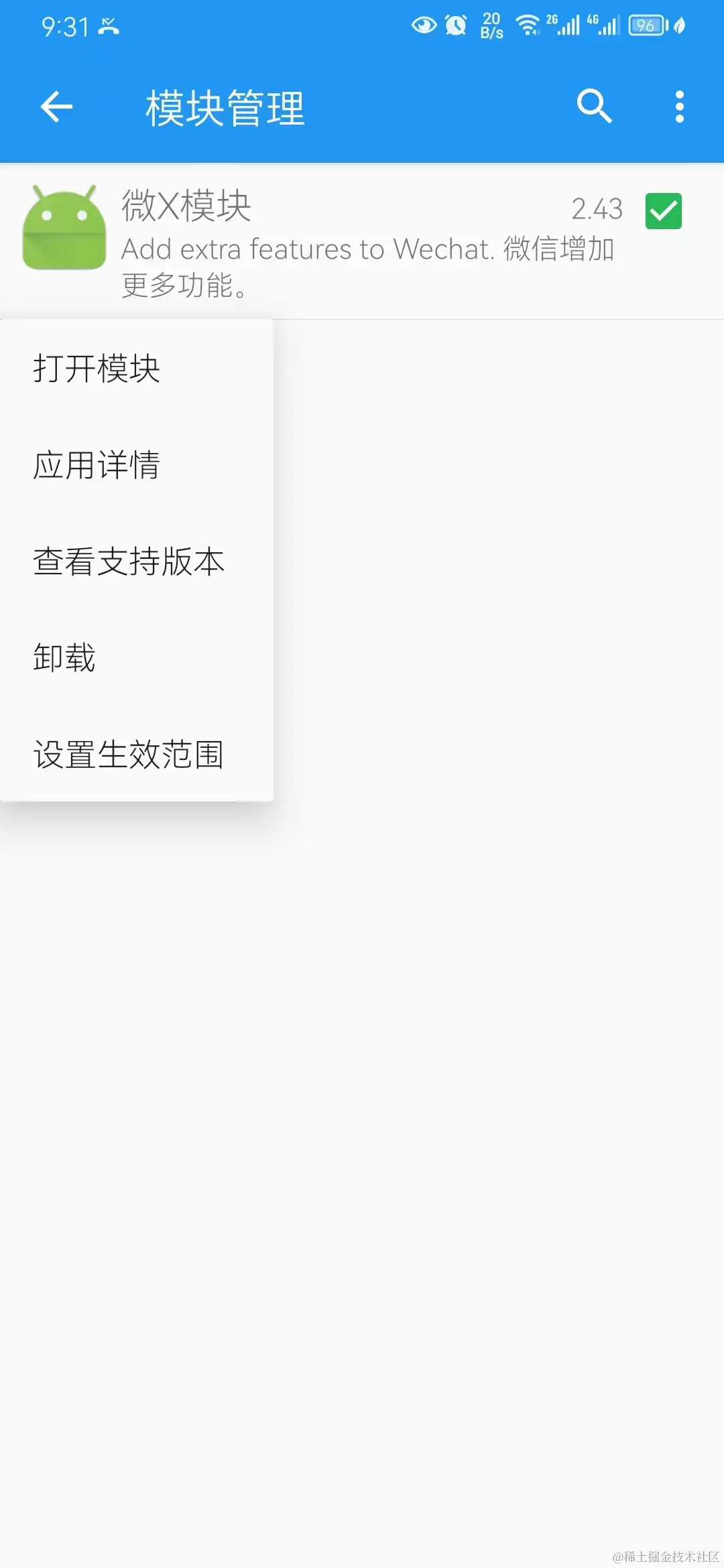类似其他正常APP安装就行,安装完成再打开太极》模块管理,长按选择微X模块》设置生效范围选择微信。