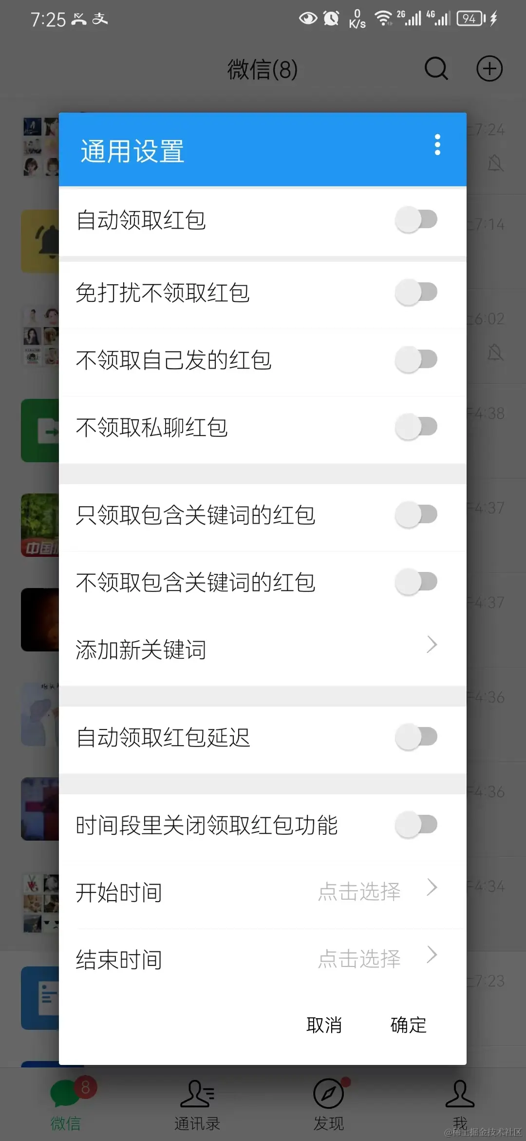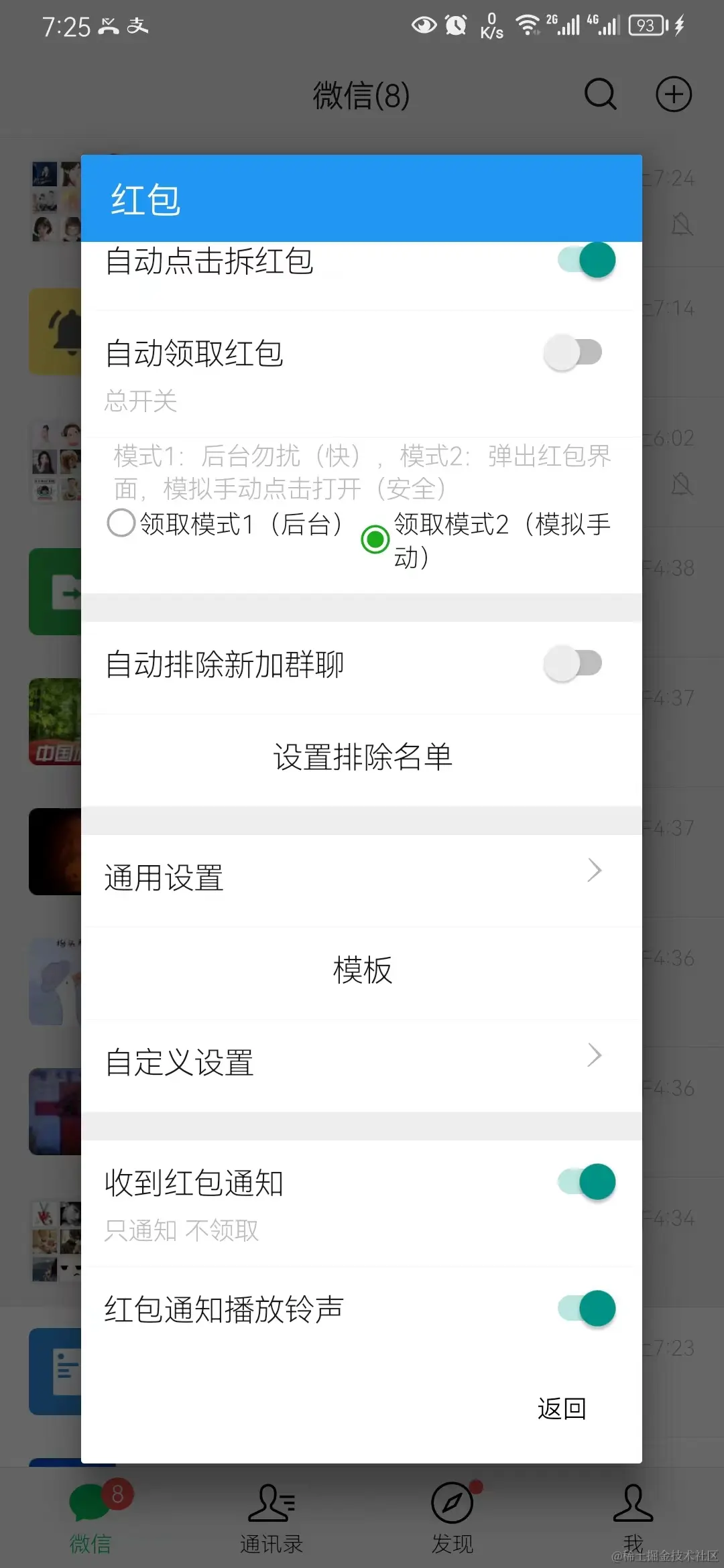 比如下面是自动领取红包设置,方式1不用打开聊天界面即可领取红包,但容易封号。
