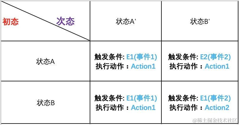 状态机可以用公式 State(S) , Event(E) -> Actions (A), State(S’)表示,即在处于状态S的情况下,接收到了事件E,使得状态转移到了S’,同时伴随着动作A的执行。