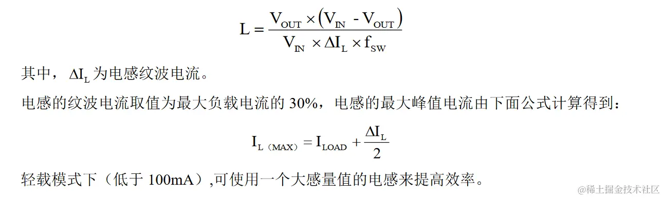 对大多数应用,电感的直流额定电流至少要比最大负载电流大 25%。为了达到更高的效率,电感的直流电阻要小于 200mΩ .电感的取值可有下面的公式计算得到: