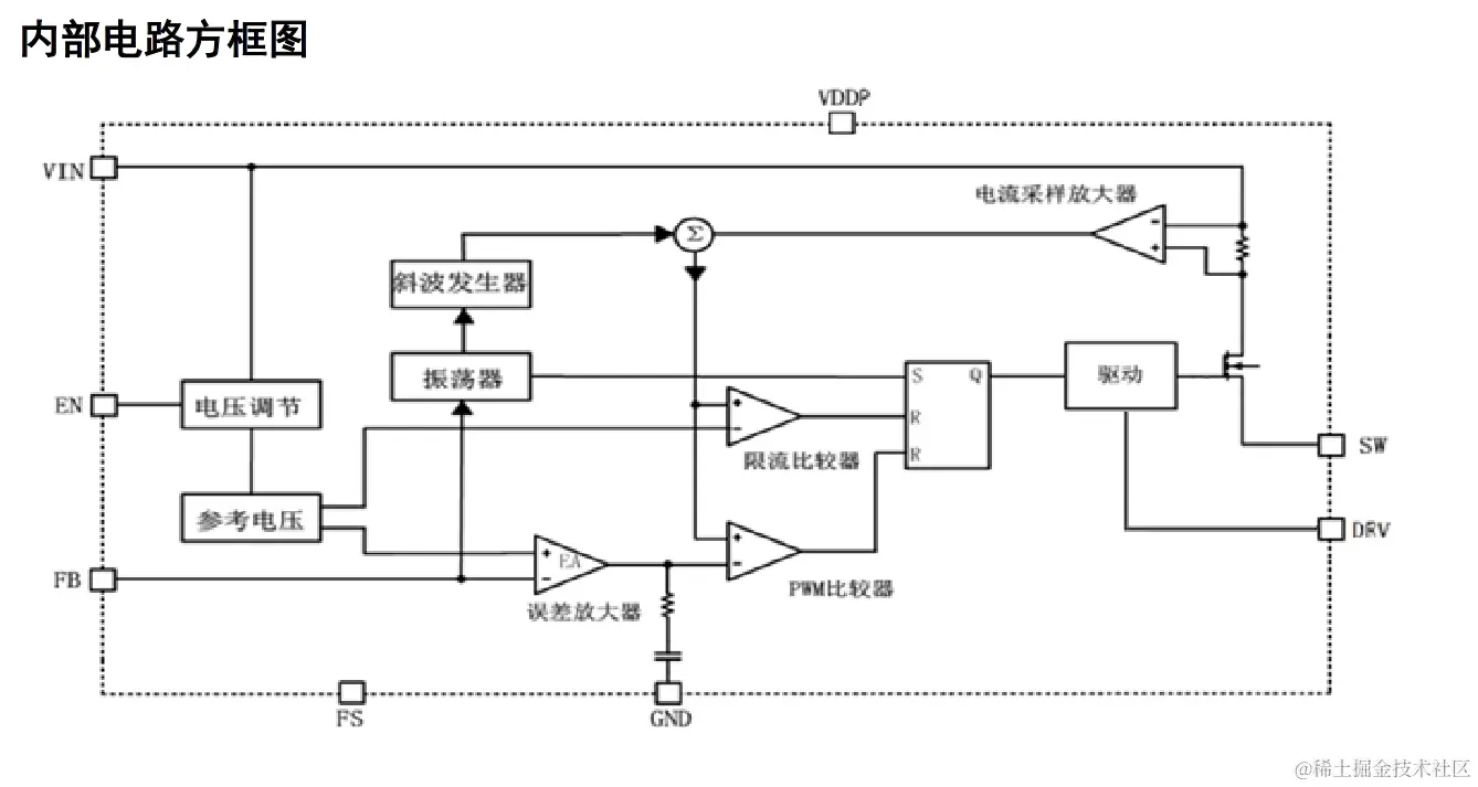 反馈电压FB与 0.82V的基准电压通过EA比较,当FB脚电压低于 0.82V时使EA输出增大。
