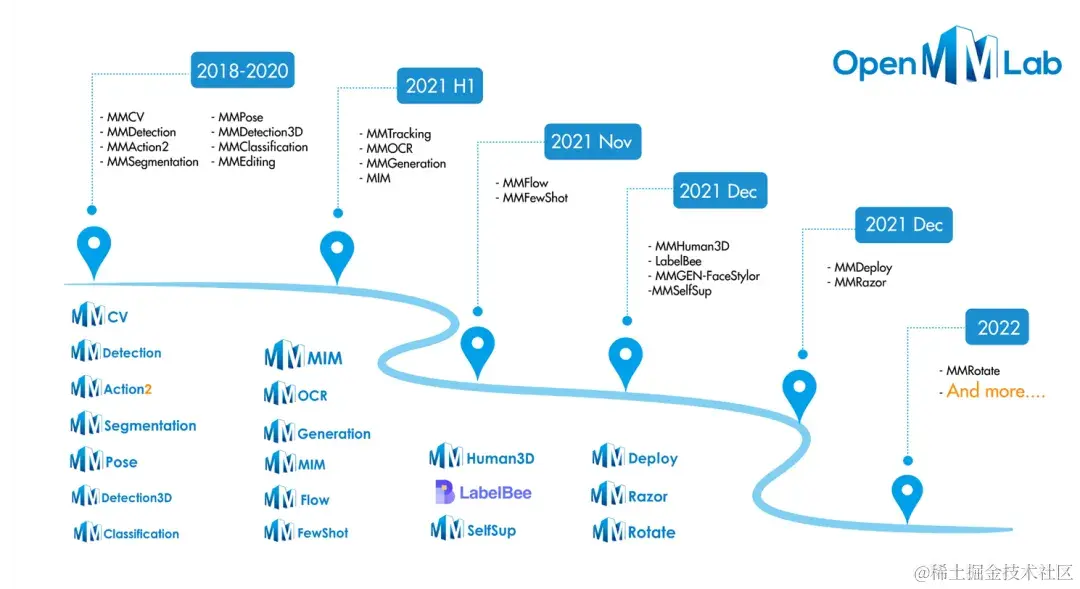 OpenMMLab 首次发布于 2018 年,起步于最先开源的 MMCV 和 MMDetection 算法库,后续我们陆续推出了 MMSegmentation、MMPose、MMTracking、MMOCR 等多个新的算法库,不断扩大我们的研究领域和影响力,从单一的开始到多元化的发展,形成了 OpenMMLab 1.0 版本。