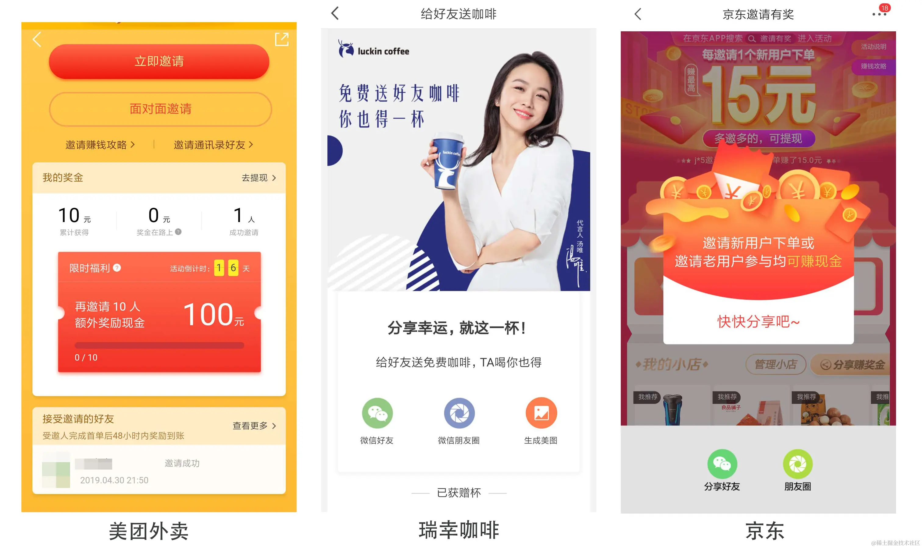常见于用户消费完成后分享,一般分享到社群,引导用户抢夺奖励池中的优惠券,优惠券可以作为二次消费的诱饵,分散到受邀用户手中,这种玩法的关键点在于奖励的“随机性”,在不确定因素下,只要不亏,用户都会有动力抢夺奖励。