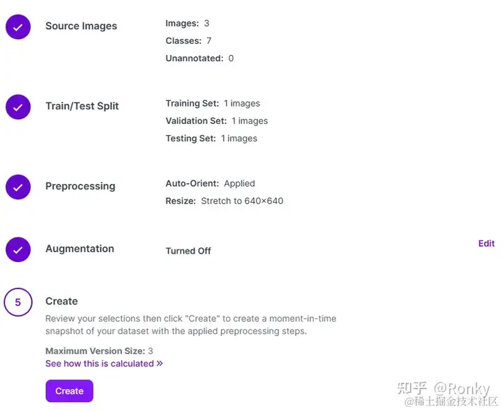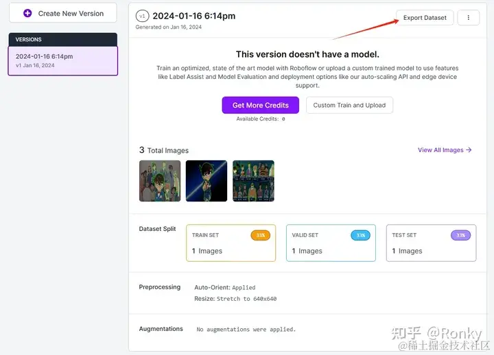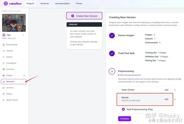 1.在Roboflow中点击生成按钮后,右侧选择需要训练的图片和训练、验证测试比例,为了提高准确度和一致性,需要注意将图片全部处理成640*640像素的大小