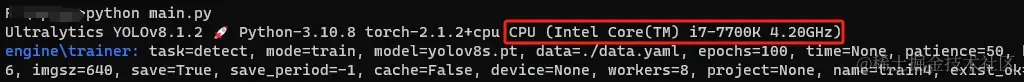 8.使用命令提示符(cmd)开始训练,看到类似以下的信息便开始训练了,但需注意,很多同学会和我这里一样显示的是CPU,没用到GPU,这就是环境没配置好,GPU的训练速度要比CPU快非常多,可以看到第二张图中的GPU_mem是0G,代表没有识别到GPU