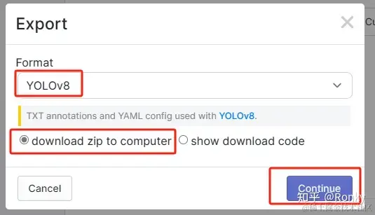 4.格式选择YOLOv8 并选择 download zip to computer后点击继续(Continue),弹出等待下载