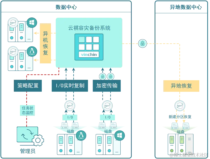 为满足部分对RTO和RPO指标敏感的用户需求,云祺科技通过结合卷远程复制技术和持续数据保护技术、以及高可用技术的原理,推出了一款基于卷为最小处理单元的实时容灾备份产品,其对于备份源对象具有良好的兼容性,无论是文件、影音、应用还是结构化数据库,甚至是操作系统都可以纳入被保护的范畴之内。逻辑拓扑图如下: