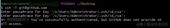 ssh -T git@github.com测试连接,当看到返回Hi XXXXXX(我们的名字)! You've successfully authenticated, but GitHub does not provide shell access.表明已经成功换了另外的端口连上 github ,这时就能在 github 上正常的上下传代码了。