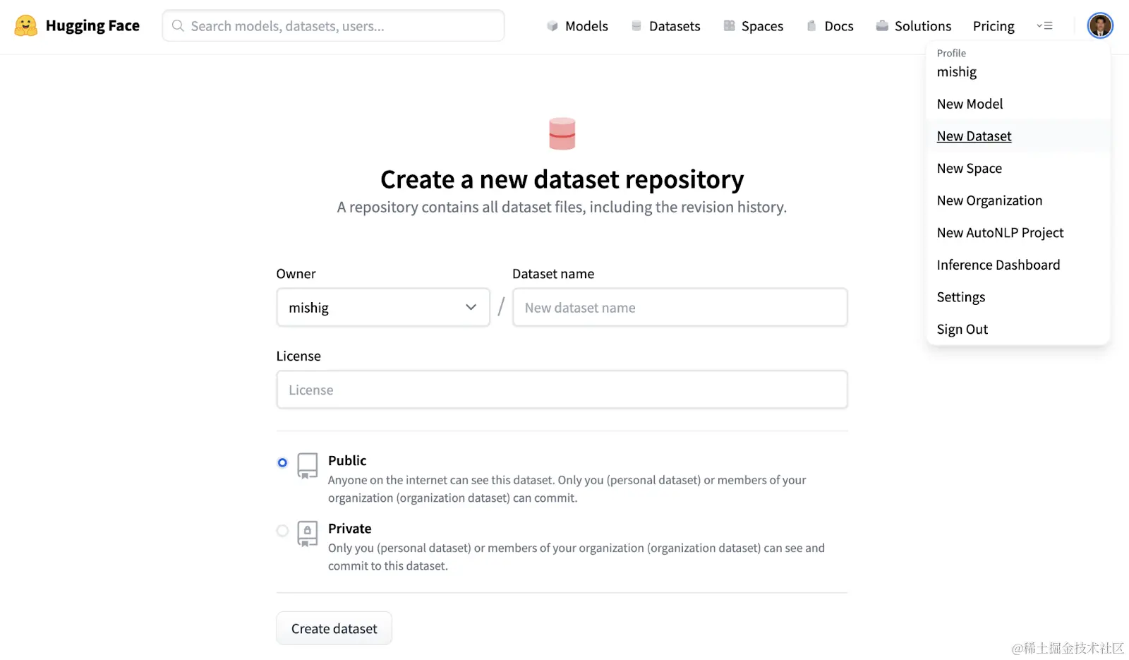 - 在 huggingface.co/new-dataset 创建一个仓库,可以在你的账户或在组织名下进行创建。