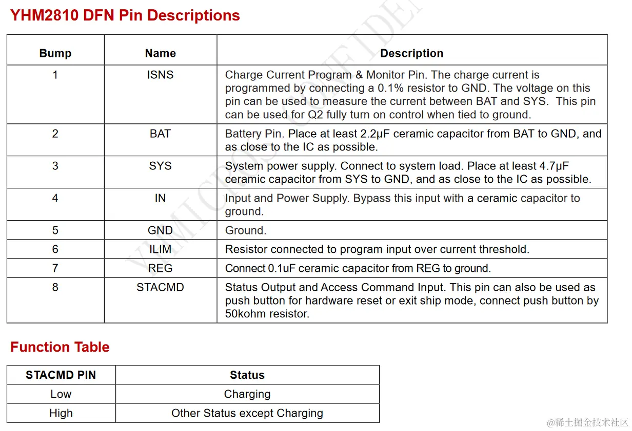 YHM2810 can deliver up to 500mA charging current, be programmed externally with a single resistor. The charge voltage is default 4.2V and adjustable by Access command. YHM2810 automatically terminates the charge cycle when the charge current drops to 1/20 of the programmed value after the final float voltage is reached. The device can report charging/discharging current for fuel gauging by current monitor output.