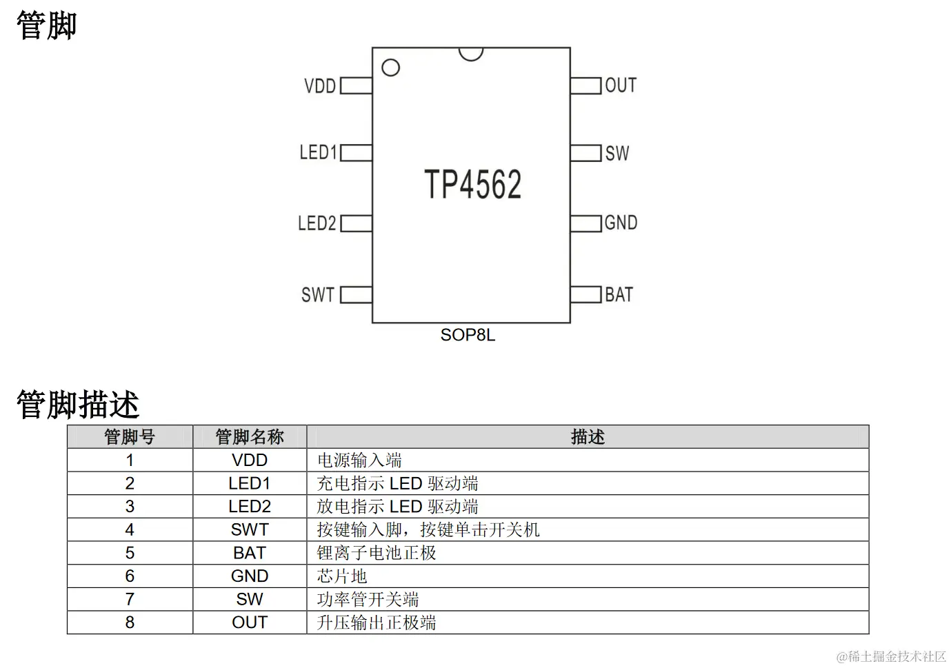 启动时,当 BAT 电压大于 3.15V 时,升压电路开始工作,工作过程中如果电池电压低于 3.05V,则 LED2 会以 2HZ频率快闪提醒电量较低,当电池电压低于 2.85V,则放电输出关闭,TP4562 进入低电流待机模式。