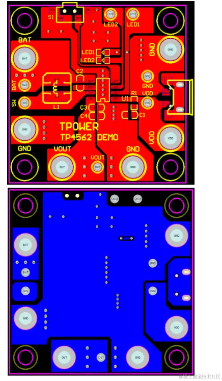 3、VDD 电容靠近芯片 VDD 脚,其地线尽量接在大面积地线上,不要经过较小的地线再到芯片和大面积地。