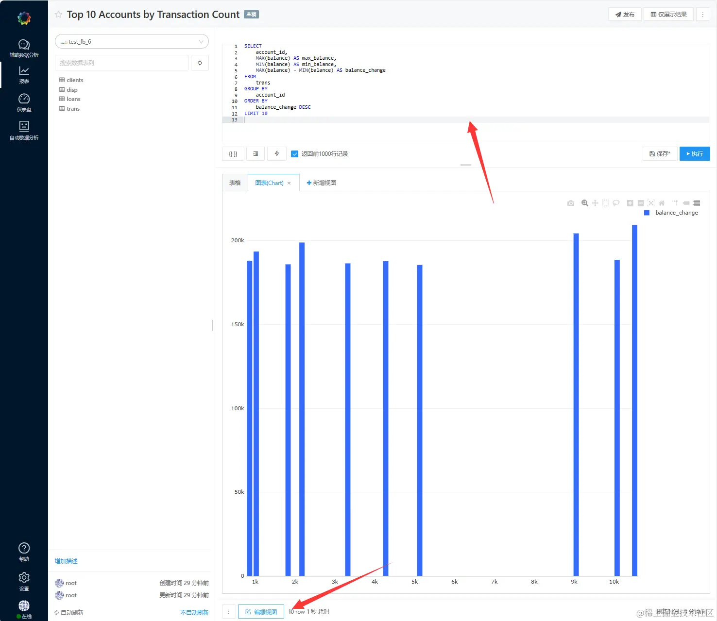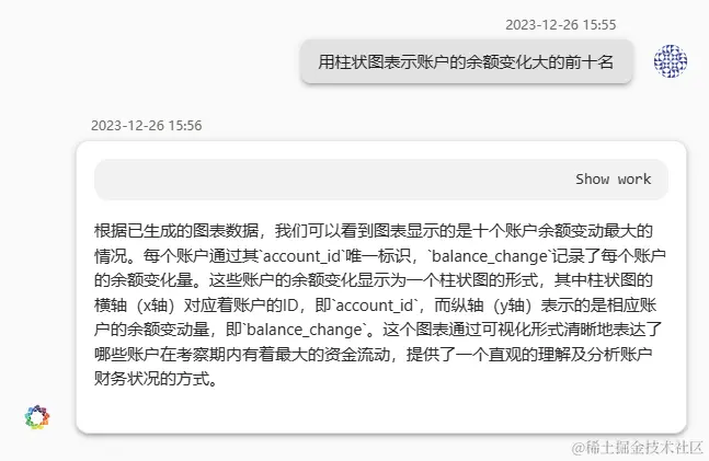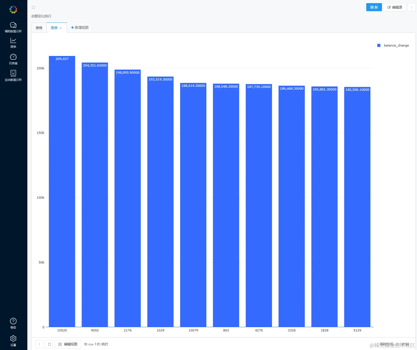 在传统的 SQL 编写中,要生成柱状图表示账户余额变化最大的前十名通常需要较复杂的 SQL 查询。尤其是涉及到对交易表中的余额变化进行计算和筛选时,需要较多的聚合函数和排序操作。