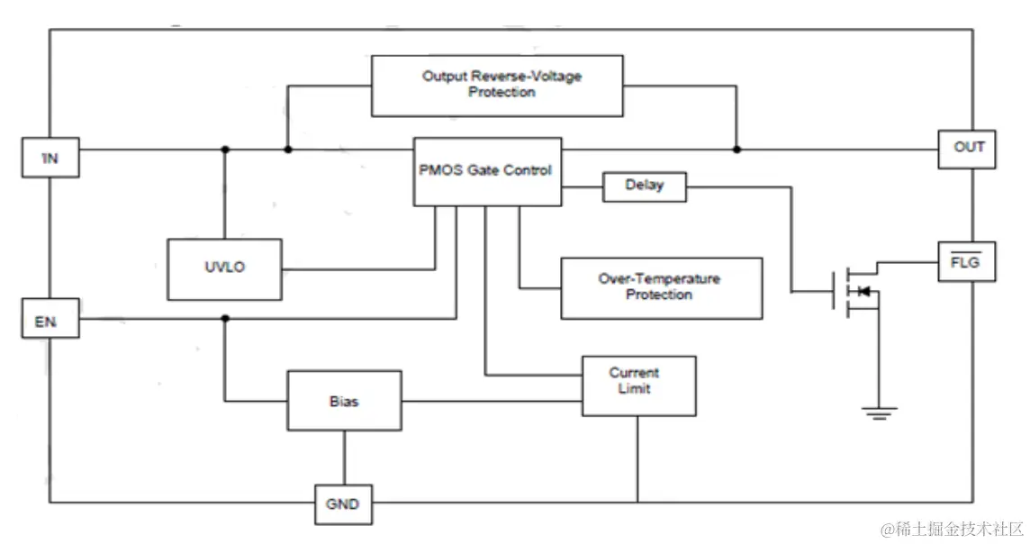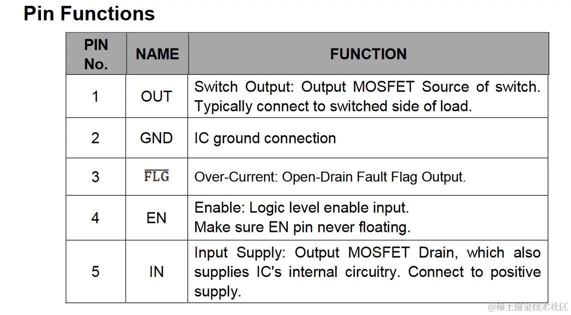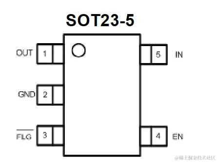 TP6062的引脚定义与引脚功能,引脚分别为OUT、GND、FLG、EN、IN。