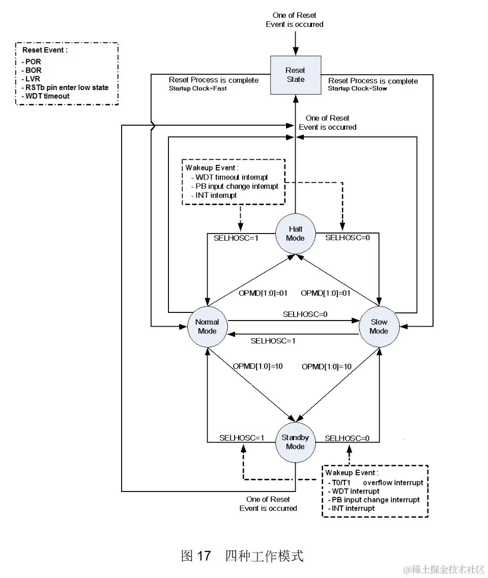 - 四种工作模式可随系统需求调整电流消耗:正常模式(Normal mode)、慢速模式(Slow mode)、待机模式 (Standby mode)与睡眠模式(Halt mode)。