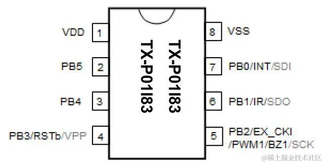 - TX-P01I83在睡眠模式(Halt mode)下的三种唤醒中断:WDT中断。PB输入状态改变中断。外部中断。