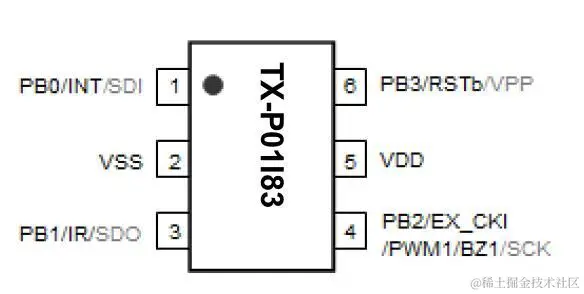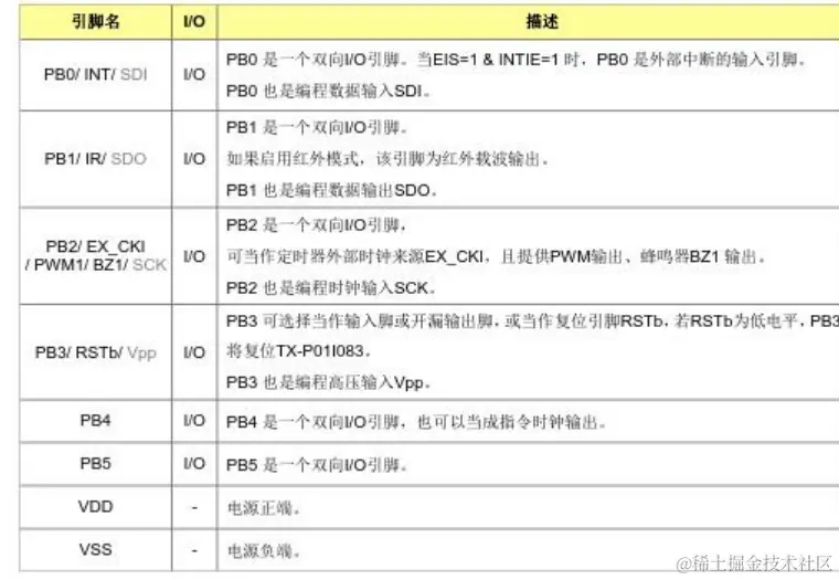 - 6 根可分别单独控制输入输出方向的I/O脚(GPIO)、PB[5:0]。
