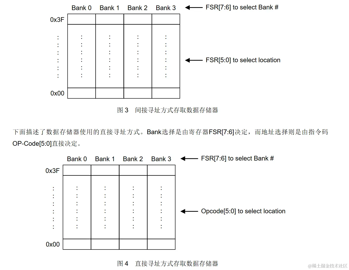 数据存储器使用间接寻址方式如下图所描述,这种间接寻址方式包含使用INDF寄存器。Bank选择是由FSR[7:6]决定,地址选择则是由FSR[5:0]而定。