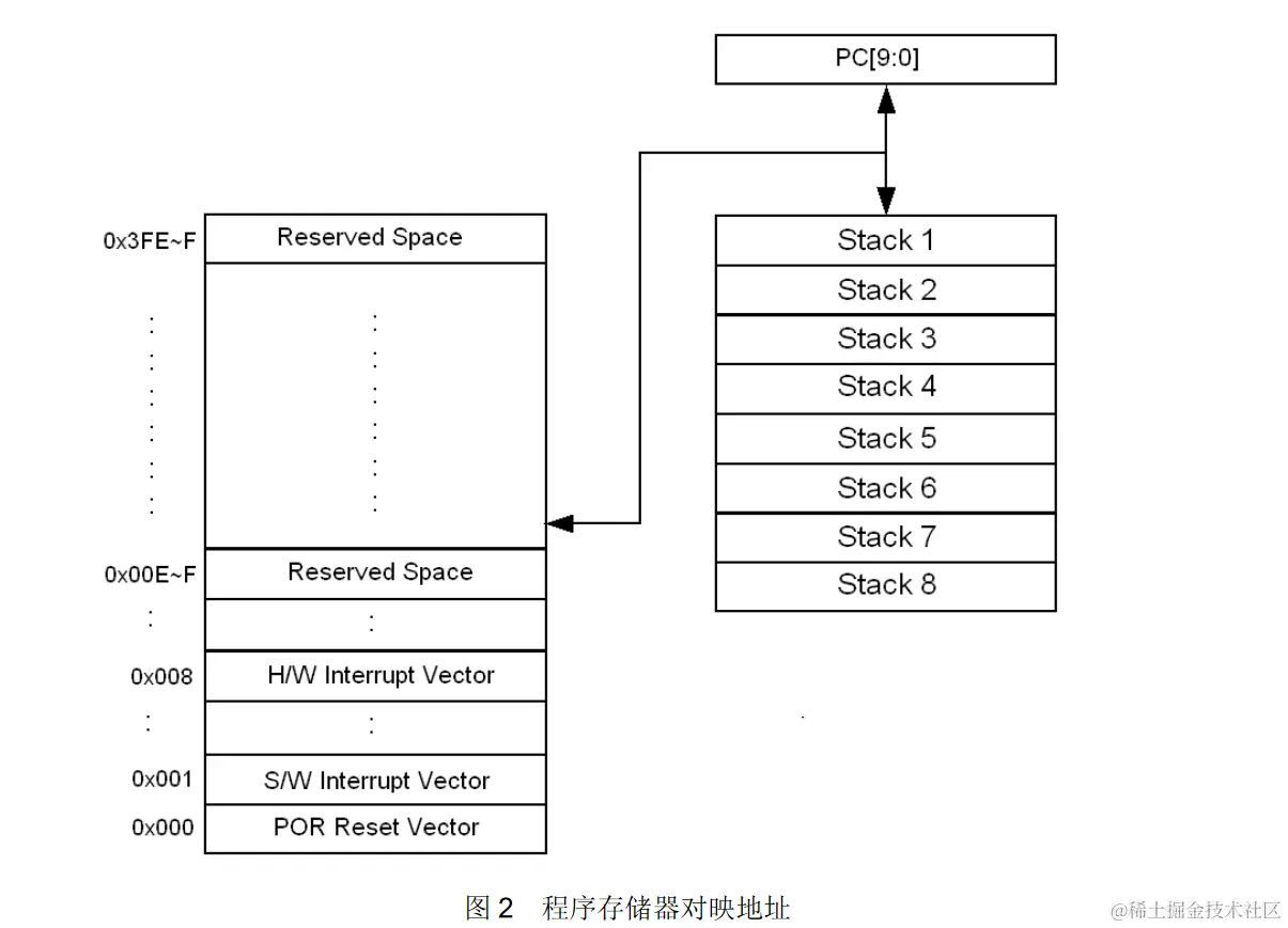 当发生子程序调用或中断情况时,下一个ROM地址写入堆栈的顶部。而当执行RET、RETIA或RETIE指令,堆栈顶部的数据会被读取并加载到程序计数器。