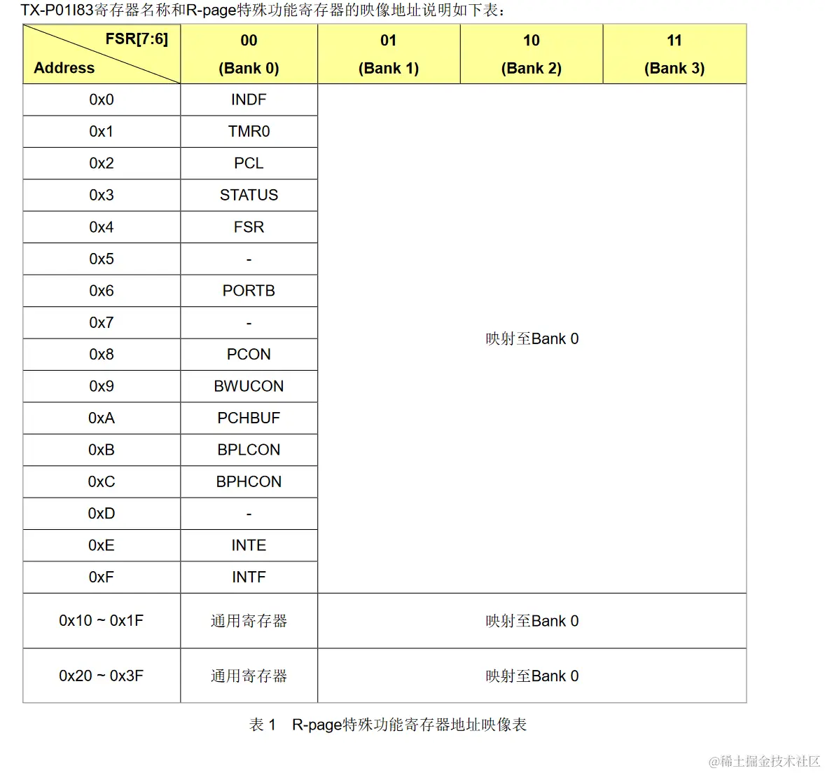 R-page特殊功能寄存器可以通过一般的指令存取,如算术指令和数据搬移指令。R-page特殊功能寄存器占用了从Bank 0 的 0x0 到 0xF。然而,Bank 1、Bank 2 和Bank 3 的相同地址会映像到Bank 0。换句话说,R-page特殊功能寄存器只存在于Bank 0。GPR占用了数据存储器的 0x10 到 0x3F地址。其它Bank地址 0x10 到 0x3F亦映射到Bank 0,如表 1 所示。