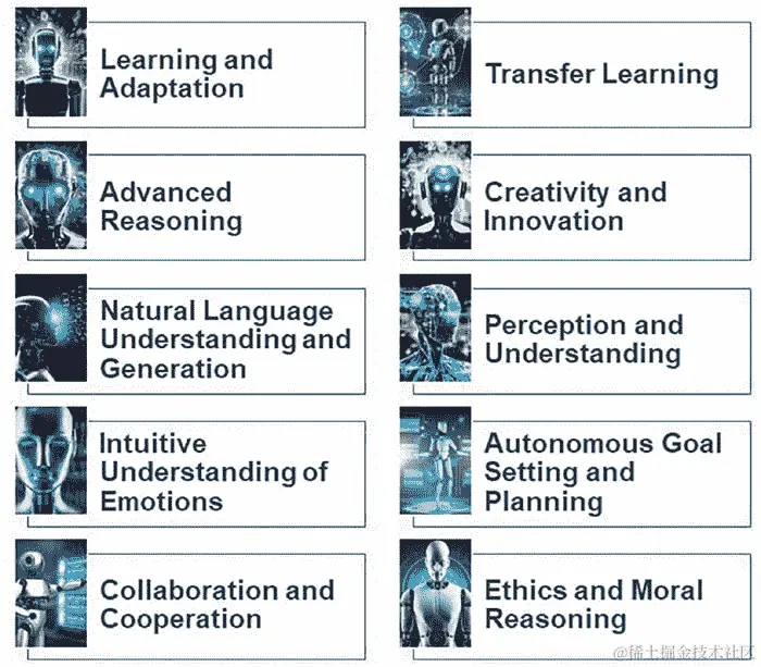 GPT-4 代表了人工通用智能(AGI)追求中的重大进展,并且超越了在复杂对话场景中提供微妙和精确回应的能力。它展示了更接近人类认知能力的能力。在这次全面评估中,我们将涵盖 GPT-4 在 10 个关键 AGI 能力方面的表现。这些包括学习和适应、迁移学习、高级推理、创造力和创新、自然语言理解和生成、感知和理解、直觉理解情感、自主目标设定和规划、合作与协作,以及道德和伦理推理(见图 1.2)。