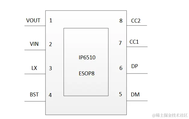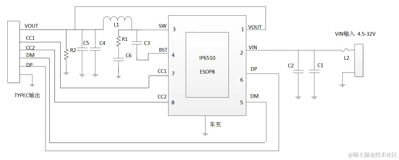 IP6510 支持 Type-C 接口输出,集成各种快充协议,可以通过 CC1/CC2 或 DP/DM 来自动识别输出端