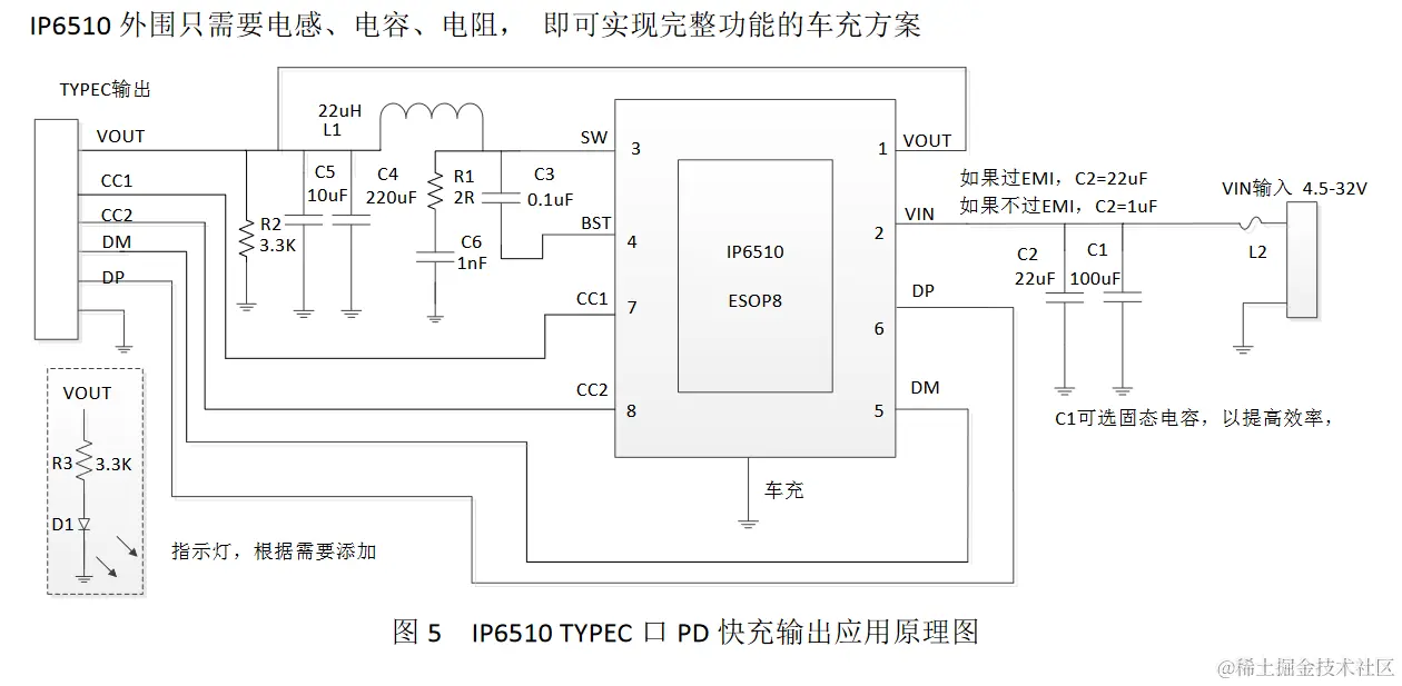 IP6510 内置功率 MOS,输入电压范围是 4.5V到 32V,输出电压范围是 3V 到 12V,能提供最大 18W