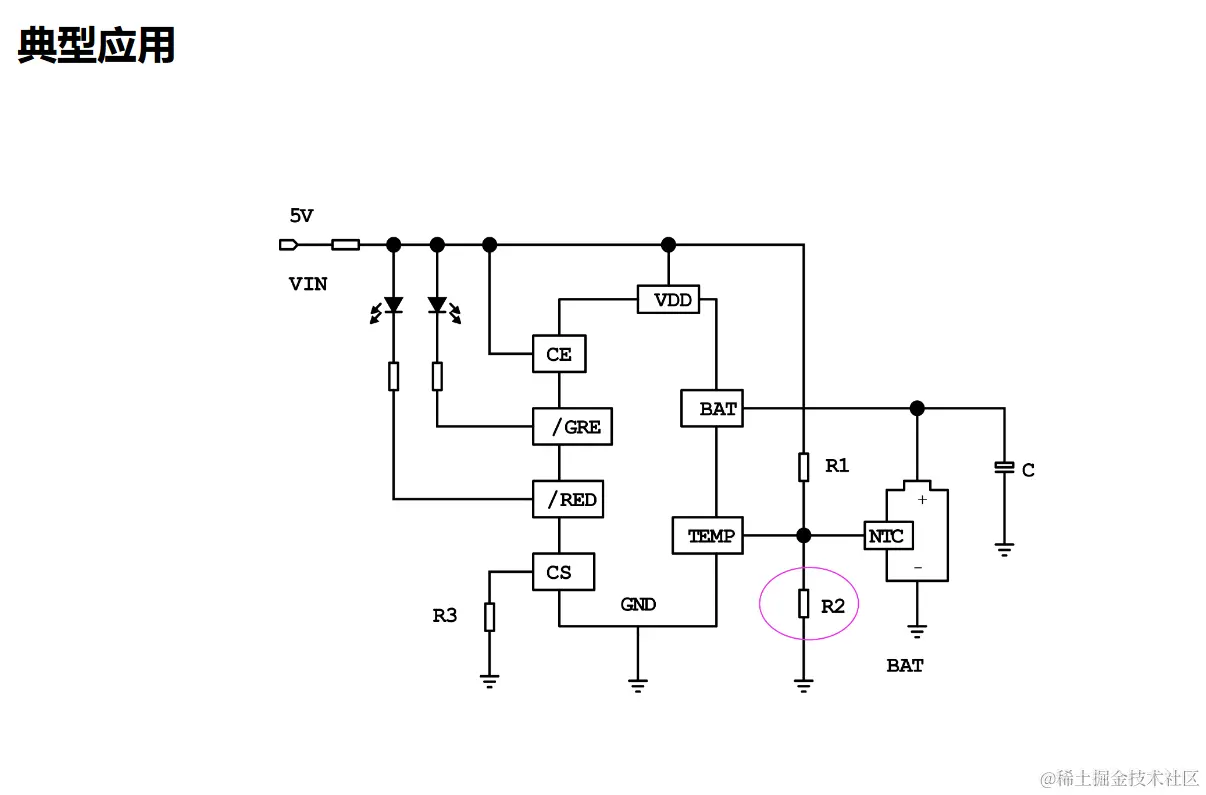 将 TEMP 管脚接到电池的 NTC 传感器的输出端。如果 TEMP 管脚的电压小于输入电压的 45%或者大于输入电压的 80%,意味着电池温度过低或过高,则充电被暂停。如果 TEMP 直接接 GND,电池温度检测功能取消,其他充电功能正常。