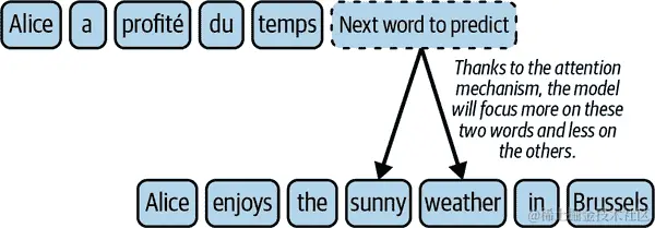 为了说明这一点,让我们以一个简单的句子翻译任务为例。假设我们有一个输入的英文句子,“爱丽丝在布鲁塞尔享受了阳光明媚的天气”,应该翻译成法文为“爱丽丝 a profité du temps ensoleillé à Bruxelles.”在这个例子中,让我们专注于生成法文单词ensoleillé,意思是阳光明媚。对于这个预测,交叉注意力会更加关注英文单词sunny和weather,因为它们都与ensoleillé的含义相关。通过专注于这两个单词,交叉注意力帮助模型为句子的这部分生成准确的翻译。图 1-2 说明了这个例子。