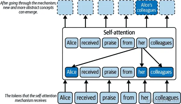 作为一个更具体的例子,考虑以下情况:“爱丽丝受到了同事们的赞扬。”假设模型试图理解句子中“她”这个词的含义。自注意力机制为句子中的单词分配不同的权重,突出显示与这个上下文中“她”相关的单词。在这个例子中,自注意力会更加关注“爱丽丝”和“同事们”这两个词。自注意力帮助模型从这些词中建立新的概念。在这个例子中,可能出现的一个概念是“爱丽丝的同事们”,如图 1-3 所示。
