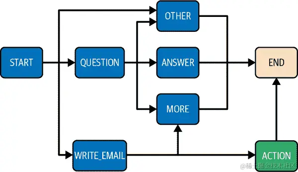 我们还可以添加一个状态:例如,WRITE_EMAIL,这样我们的助手就可以检测用户是否希望添加电子邮件。如果缺少主题、收件人或消息,我们希望它能够要求更多信息。完整的图表看起来像图 3-8。