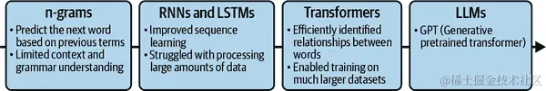 LLM 的发展可以追溯到几年前。它始于简单的语言模型,如n-grams,它试图根据先前的单词预测句子中的下一个单词。N-gram 模型使用频率来做到这一点。预测的下一个单词是在 n-gram 模型训练的文本中跟随前面单词的最常见的单词。虽然这种方法是一个很好的开始,但 n-gram 模型对于理解上下文和语法的改进需要导致不一致的文本生成。