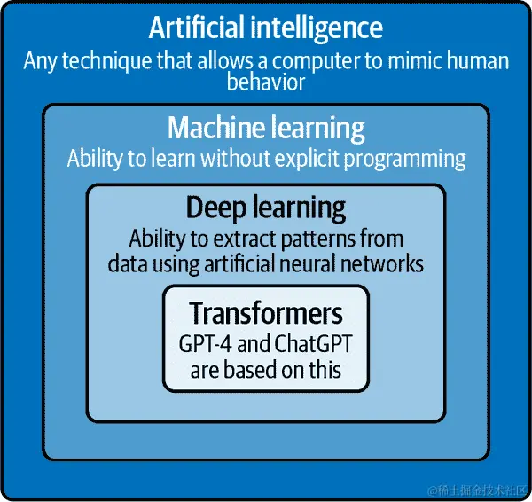 GPT-4 和 ChatGPT 基于一种称为transformers的特定类型的深度学习算法。变压器就像阅读机器一样。它们关注句子或文本块的不同部分,以理解其上下文并产生连贯的回应。它们还可以理解句子中的单词顺序和它们的上下文。这使它们在语言翻译、问题回答和文本生成等任务中非常有效。图 1-1 说明了这些术语之间的关系。