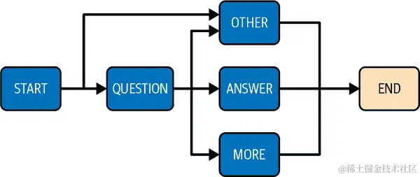 为了从一个状态转换到另一个状态,我们定义了一个函数,调用 ChatGPT API,并基本上要求模型确定下一个阶段应该是什么。例如,当我们处于QUESTION状态时,我们用以下提示模型:如果你可以回答问题:ANSWER,如果你需要更多信息:MORE,如果你无法回答:OTHER。只回答一个 `单词``。