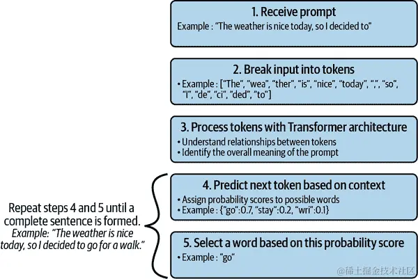 这个过程然后被重复,但现在上下文变成了“今天天气很好,所以我决定去”,先前预测的“去”被添加到原始提示中。模型可能预测的第二个标记可能是“散步”。这个过程重复进行,直到形成一个完整的句子:“去散步”。这个过程依赖于 LLM 学习从大量文本数据中学习下一个最有可能的单词的能力。图 1-5 说明了这个过程。