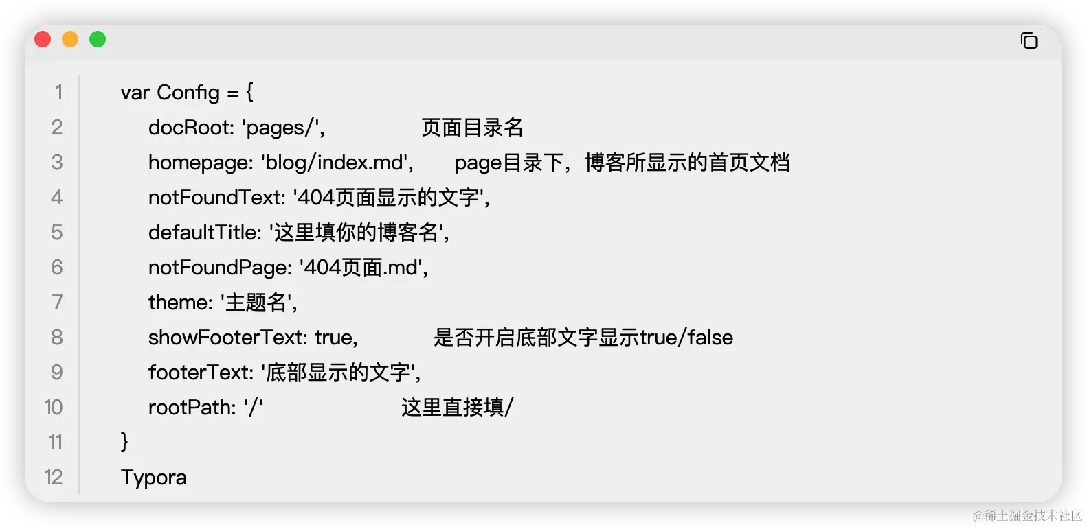 2、博客核心配置文件是config.js ,这个文件里有设置主题,博客名字,博文存放目录等等具体参看下面的解释3、配置好了之后的路径是: /?docs/xx.md