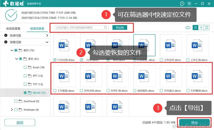 步骤4:等待软件深度扫描完成,会呈现更多的数据,如果扫描结果比较多,可以直接在 【筛选器】 中输入需要恢复的文件的名称、类型、大小等,定位到文件后,点击【导出】 。